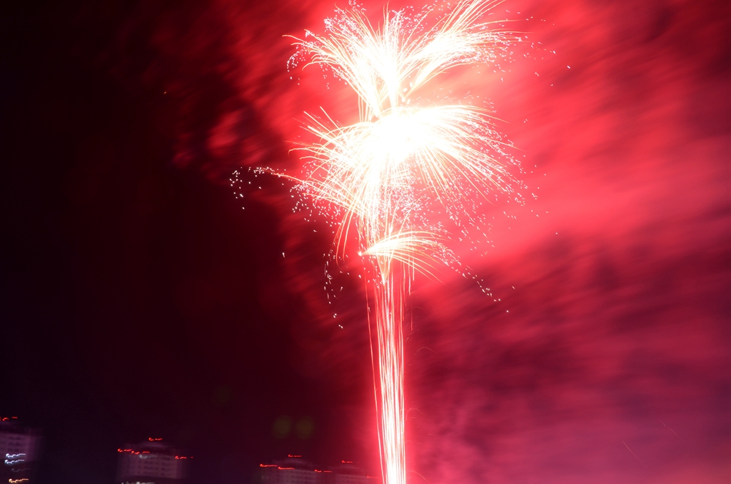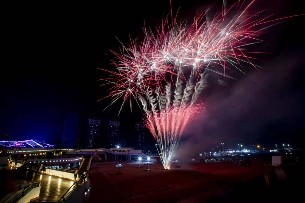 晚8點整,隨著突如其來的炸響,煙花秀開始了,一團團彩色的光芒快速上升,“啪”,一朵“花兒”在空中綻放!沿著海灘一齊點燃,幻化出一道道海上的彩虹,如詩如幻、剎那芳華,炫美煙花照亮了“金潮”的未來!孔雀開屏,真的像孔雀開了屏一樣,形狀呈扇形,絢麗奪目;搖錢樹,火樹銀花搖曳多姿,隨著聲響,金色的,銀色的,如雨般落下;還有錦上添花,繁花似錦,萬事順,步步升,好運來,都是吉利的名字。升入空中的煙花,將夜晚黑峻峻的海面映得五彩斑斕,流光溢彩。煙花如流星雨般落入海面、沙灘,說不盡的浪漫和美麗。那些煙霧繚繞著,如夢似幻,分裂成無數(shù)小小的光點,被海風一吹,很快就散開了。煙花與音樂交相輝映,美輪美奐,定格在了金脈廣場上空。