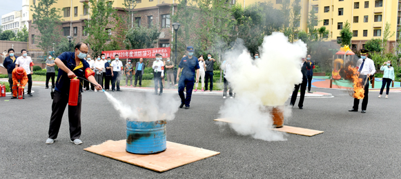 7月23日,在招遠(yuǎn)市金潮地產(chǎn)格林小鎮(zhèn)小區(qū)內(nèi),兩輛消防車??吭谠簝?nèi),消防人員整裝待命;現(xiàn)場(chǎng)擺放著數(shù)十只干粉滅火器,20余名物業(yè)工作人員和居民代表整齊列隊(duì),做好了滅火的各項(xiàng)準(zhǔn)備。這是山東永升潤(rùn)和物業(yè)公司與招遠(yuǎn)市消防救援大隊(duì)聯(lián)合舉行小區(qū)消防實(shí)戰(zhàn)演練的場(chǎng)景。